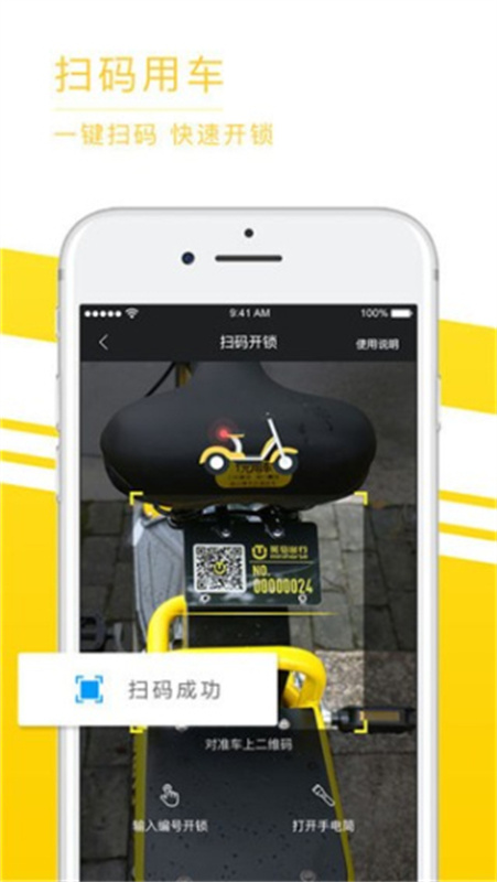 第二步:扫码开锁(车座下方)或输入车辆编号解锁