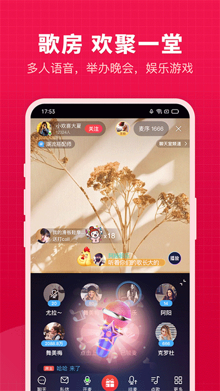 歌房:欢乐爆豆、幸运礼物、礼物挑战、麦位名称、麦上游戏、多人合唱,实时对唱,播放歌曲/视频,增进感情,促进破冰,避免尬聊。