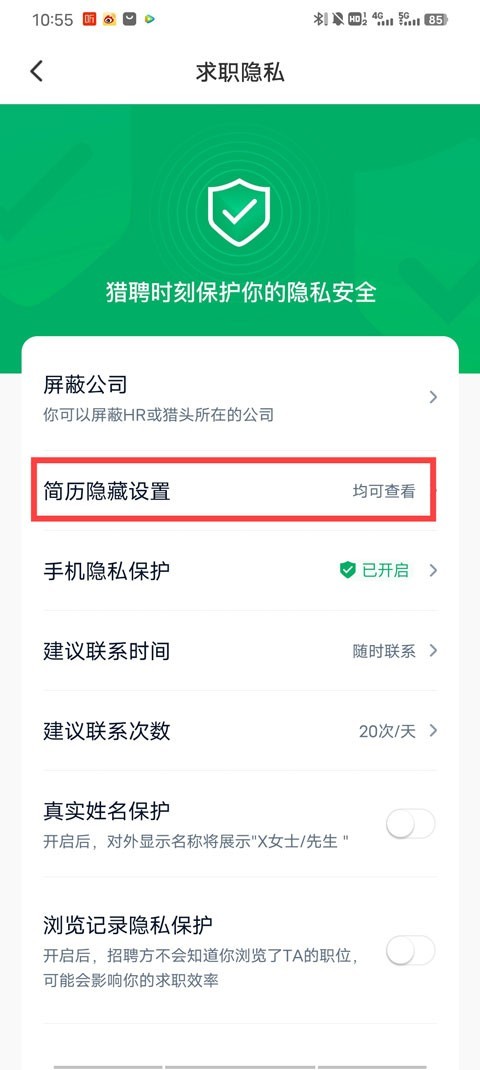 3、在简历隐私设置中,我们可以看到对企业和猎头隐藏简历,我们选择打开隐藏简历