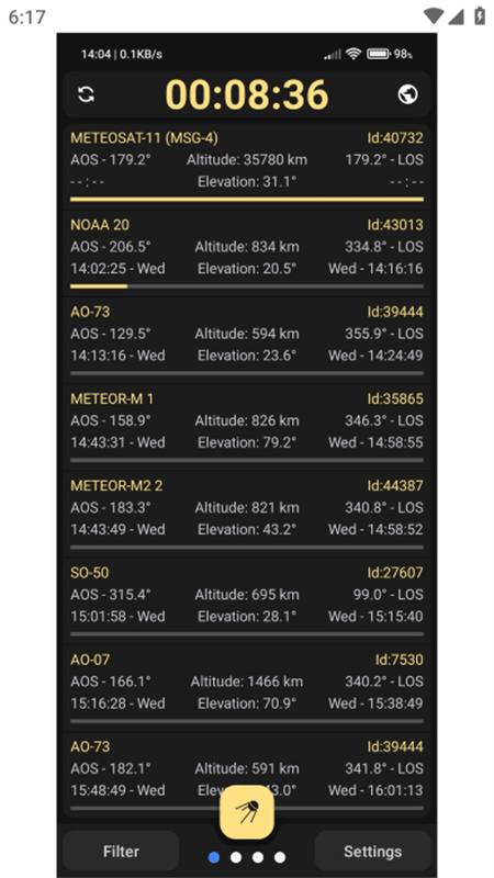 Look4Sat软件是一款专门为了安卓平台射击的一款微信过境以及入境预测的软件。你可以依托这款软件,以一种直观和强大的方式来探索浩瀚的天空,这里不但有业余的无线电爱好者、科研人员,还有各种对天文学充满了喜爱的普通用户。Look4Sat软件之中可以让你轻轻松松的掌握太空轨道上超过5000颗活动卫星的动态,不管是实时跟踪还是未来一周的预测,都可以得到准确的消息哦。