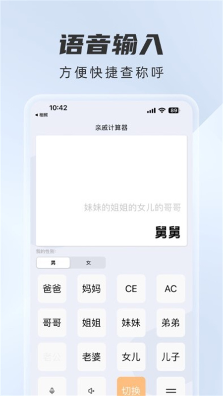 辈分计算器app是一款相当实用的家庭关系计算器类型软件,在这款软件之中可以快速的帮你了解直系亲属之间的辈分关系,只需要简单的输入相关的信息,就可以非常清晰的衍生出各种家庭关系的辈分以及称呼,让你在遇到家庭聚会的时候完全不需要担心任何的称呼问题。辈分计算器app之中可以很好的帮助你完成一系列的控制,输入正确的关系就可以得到一个正确的称呼体验哦。
