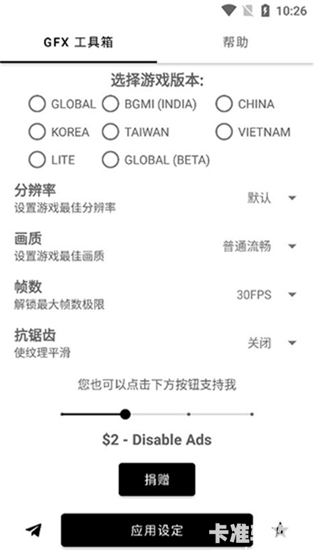 1、想要使用GFX工具箱来提高PUBG、和平精英画质的话,大家需要先在主页的顶端点击选择不同的版本,其中包括有国际服、国服、韩服和台服等八个版本,在选择后就能对画质进行自定义修改了。
