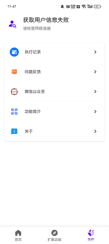 4、进入 “我的” 界面,能查看执行记录,也可提交问题反馈、关注公众号,了解功能相关信息。