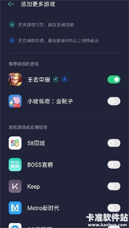 2、第一次打开,我们需要先添加游戏,如果手机里还没游戏,点击“前往下载”,如果已经有游戏的话,点击下方“手动添加”,打开对应游戏后的开关就可以添加了。