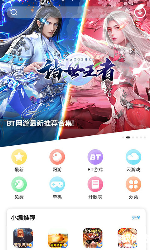 2、主页页面:最新、网游、BT游戏、云游戏、单机、开服表、分类、专题8大板块,每个板块都各具特色。