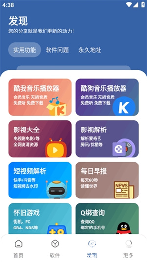 4:进入“发现”板块,可查看实用功能、软件问题、永久地址等分类内容,如音乐播放器、影视解析、短视频去水印等工具。