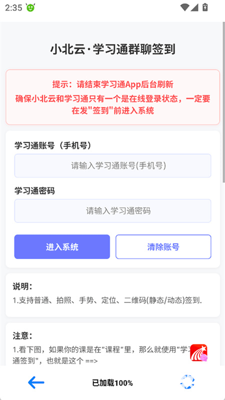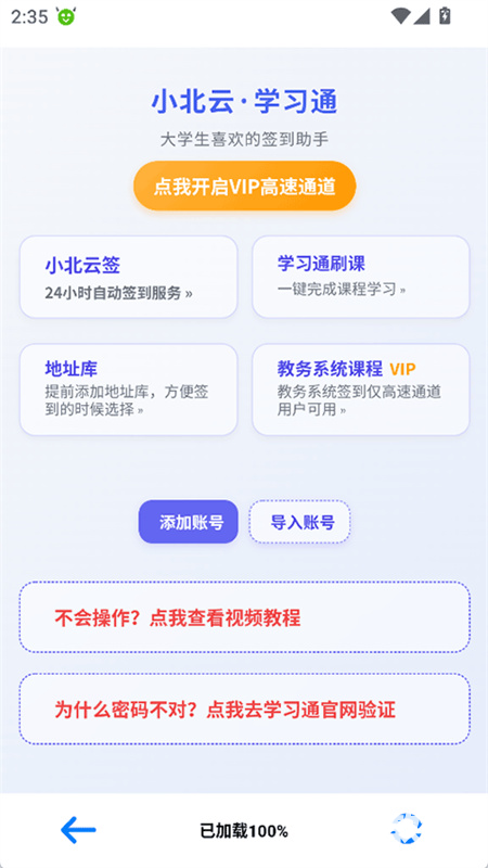 2、例如选择学习通课程签到,可以进行添加或导入账号进行登录