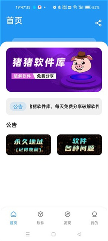 1、猪猪软件库2.6版本提供了四个板块,首页板块中拥有公告专区,让用户可以查看永久地址,了解软件问题;