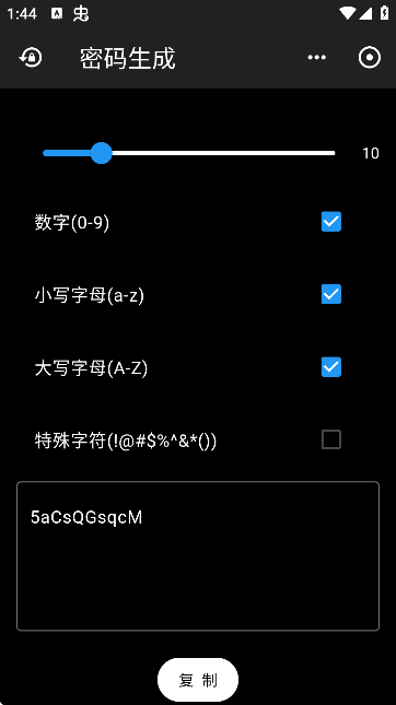 工具提供多种选项,用户可自定义密码长度、字符类型、大小写及是否包含数字,完成选择后自动生成密码。