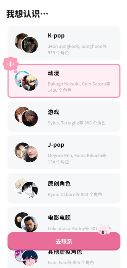 虚拟角色资源:内置众多韩团、日团人气明星的AI模拟角色,如BTS成员,田柾国、金泰亨等、StrayKids、SEVENTEEN等组合成员,用户可直接添加这些角色为联系人,与其展开对话互动,角色设定贴近偶像的公众形象特质。