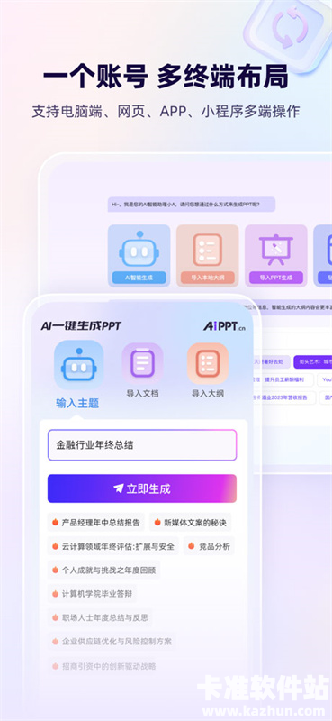 AiPPT是一款AI人工智能驱动的PPT在线生成工具,专为android系统的手机而开发,该软件基于人工智能大模型和自然语言处理技术,用户无需复杂操作,只需要输入主题,一句话,一分钟,即可一键生成高质量PPT。