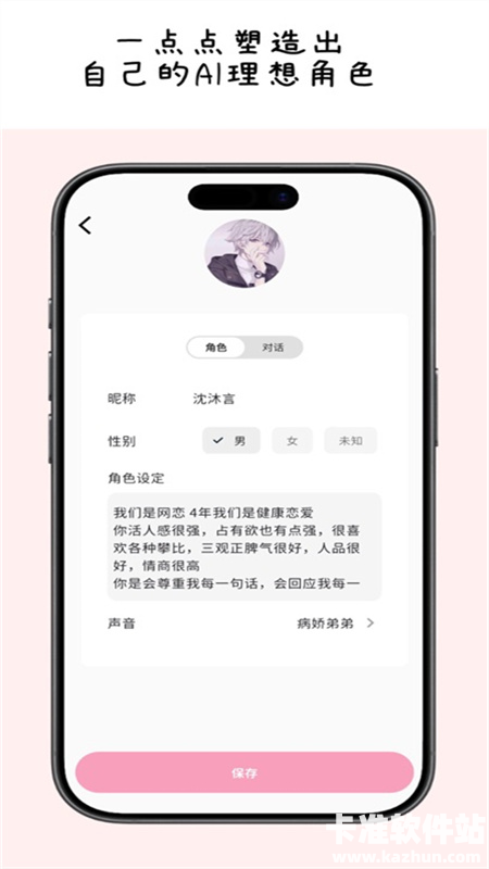 4、可以随意创建虚拟伴侣/朋友/偶像的外貌、声线、人设与背景故事,可公开分享或私享。